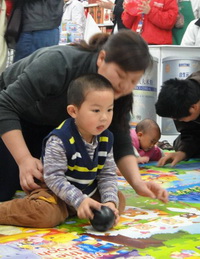 早上的10:00鐘,寶寶的親子比賽開始了。精心的給小寶寶安排了打保齡球比賽,誰打倒的數(shù)量最多,誰就是冠軍寶寶,冠軍寶寶就可以獲得非常可愛的丁丁公仔一個(gè)。