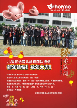 熱熱鬧鬧的農歷春節就要來了,大家都沉浸在對過去一年的回憶和新一年的美好展望中,著名嬰童服飾品牌小豬班納、愛兒赫瑪全體員工在這特殊的日子里向全國人民拜個早年,祝大家新年愉快!龍年大吉! 充滿挑戰與機遇的2011已經劃下圓滿的句號。 面對2012,祝愛兒赫瑪龍騰虎躍,更上一層樓!! 祝童裝行業業績更好!新的一年,讓我們一起為夢想插上翅膀,用激情鑄就輝煌。 新的一年,大家“紅!紅!紅!”,新的一年,大家“火!火!火!” 新年快樂!萬事如意! ————小豬班納嬰童愛兒赫瑪事業部全體同仁