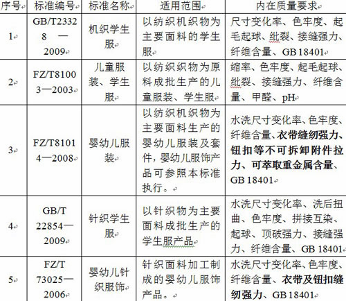 我國現(xiàn)行紡織品標(biāo)準(zhǔn)體系中,適用童裝產(chǎn)品的標(biāo)準(zhǔn)有5個(gè),分為梭織和針織兩大類。