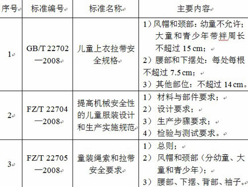 該系列標(biāo)準(zhǔn)專注于童裝小零部件安全性能,以避免兒童危險(xiǎn)事故為主要原則和依據(jù),規(guī)定了兒童上衣拉帶的安全規(guī)格、童裝使用繩索和拉帶的安全要求、童裝材料、設(shè)計(jì)、生產(chǎn)的實(shí)施規(guī)范,已于2009年8月1日起正式實(shí)施。詳細(xì)內(nèi)容見表2。