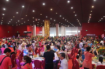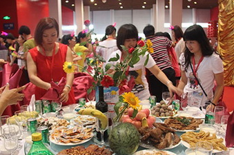 訂貨會的第三天,舉行了別開生面的百家宴會,來自全國各地的客商紛紛帶來了當(dāng)?shù)氐拿牢叮貌煌男问健⒉煌姆椒惲谐鰜恚瑏碜院系尼u板鴨、潮汕的牛肉丸、順德的魚生、河南的大餅等,集聚五湖四海的美味,琳瑯滿目,歡聚一堂的家人,一邊欣賞來自各地自編自導(dǎo)的文藝節(jié)目、卡拉ok大賽,一邊品嘗百家的美味,全體小豬班納人,歡聚一堂,開懷暢談,其樂融融。