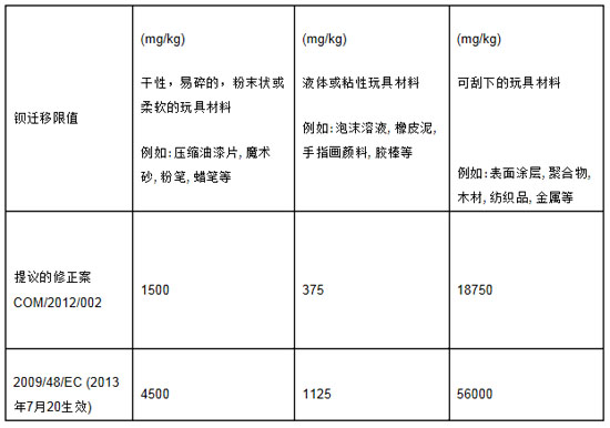 ·玩具指令2009/48/EC制定了玩具或玩具組件中19種元素的遷移限值。玩具材料中各元素的遷移量不應超過列表中的限值。此限值的制定參考了玩具中的化學元素的健康安全限值,也稱作每日耐受量(TDI) 。
