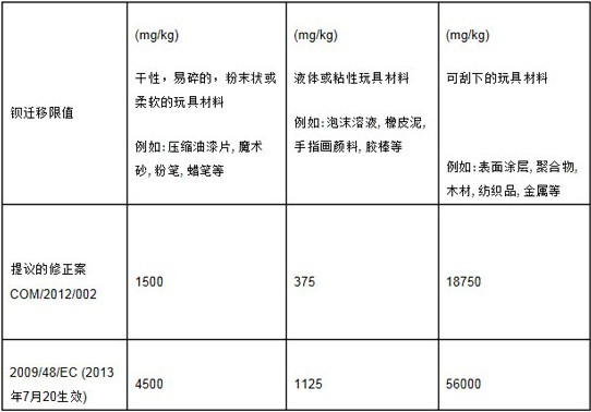 ·玩具指令2009/48/EC制定了玩具或玩具組件中19種元素的遷移限值。玩具材料中各元素的遷移量不應超過列表中的限值。此限值的制定參考了玩具中的化學元素的健康安全限值,也稱作每日耐受量(TDI) 。