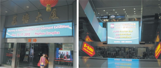 近日,在荔湖大廈中八童裝婦嬰用品廣場、荔塘大廈童裝城、荔灣玩具批發市場等多個大型孕嬰童產品專業賣場,都出現了“2012廣州國際孕嬰童用品服飾展覽會”的宣傳廣告。無論是在賣場主入口、大堂、抑或是電梯旁、主通道,都隨處可見新之聯嬰童展的“身影”以LED視頻廣告、燈箱廣告、戶外廣告牌、X展架等多種形式出現。