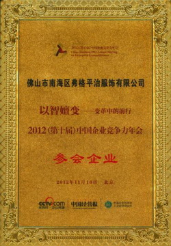 在“2012最具競爭力中小企業評選”頒獎典禮上,佛山市南海區弗格平治服裝有限公司榮獲“2012年度最具品牌誠信中小企業”的榮譽,是這次“2012最具競爭力中小企業評選”中唯一入選的童裝企業。