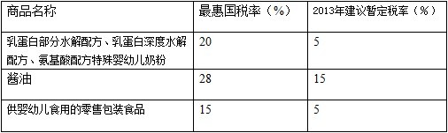 財政部通知,2013年我國將對780多種進口商品實施低于最惠國稅率的年度進口暫定稅率,其中特殊配方嬰幼兒奶粉關稅為5%,顯著低于最惠國15%的待遇,為目前稅率的一半。