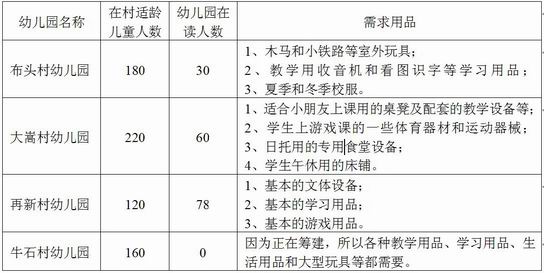 3、企業可以直接認捐一所貧困幼兒園,購買該所幼兒園所需全部物資,所需資金約3萬元。