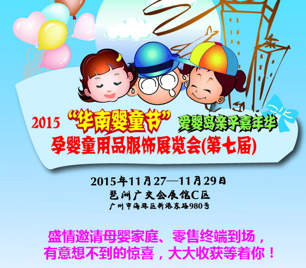 廣東省孕嬰童用品協會、廣東愛嬰島、廣州媽媽網聯合舉辦第七屆“華南嬰童節”,將在2015年11月27-29日琶洲廣交會展館C區隆重巨獻。本次展會迎來新的變革,轉型為B2C為主體的華南獨具特色的大型展會。集中打造成品牌展示、互動體驗、歡樂購物的童博會。